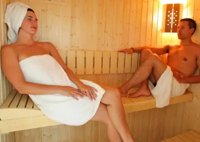 Le Sauna Finlandais offre un bain de chaleur sèche à 60 – 80 °C. L’ambiance chaude et l’odeur du bois raviront vos sens. Ici, la chaleur contient 2% à 10% d’humidité (contre 100% pour le hammam).